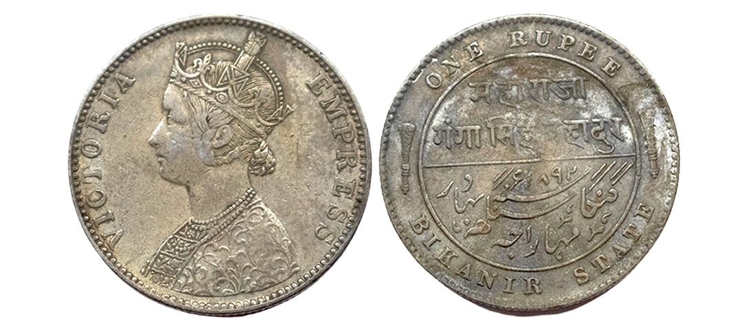 Bikanir, Sardar Singh (AH 1268-1289 / 1851-1872 AD), Silver Rupee, 11.34Grms, in the name of Alamgir II, AH 1229, various symbol on rev. (KM # 37). Fine.