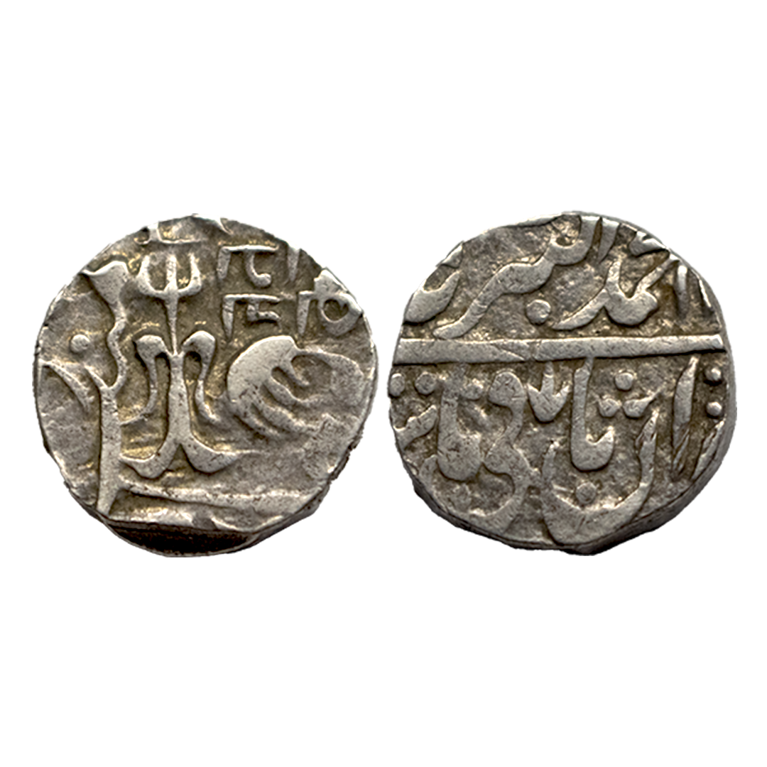 Gwalior, Daulat Rao Sindhia (1794-1827 AD), Silver Rupee, Isagarh Mint, in the name of Muhammad Akbar II, struck under the authority of Jean-Baptiste Filose; cannon and snake symbols on obverse and fly-whisk (chauri) and battleaxe symbols on reverse.Graded MS64 by NGC, Rare.