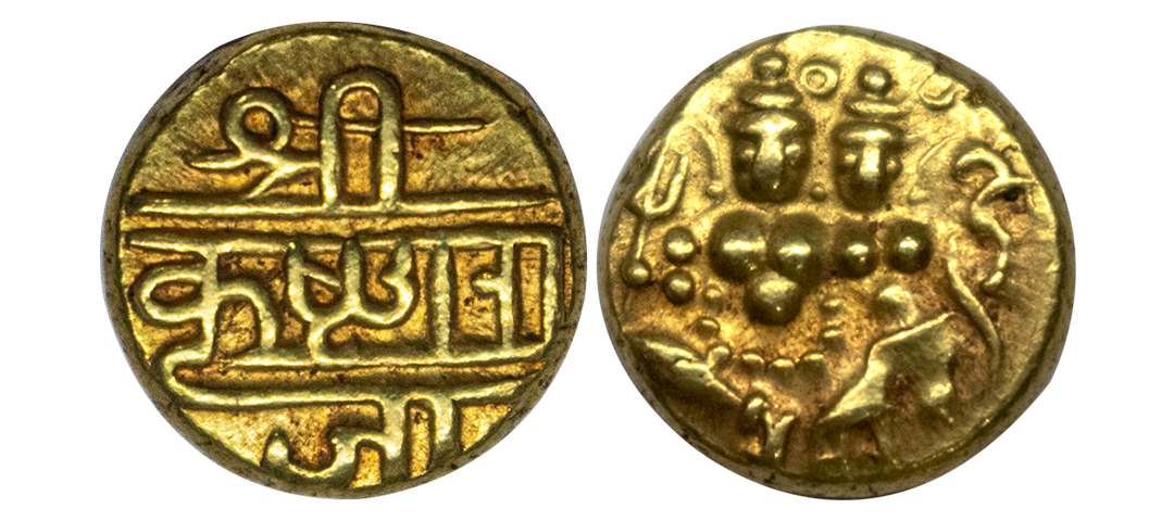Mysore, Krishna Raja Wodeyar (AH 1225-1285 / 1810-1868 AD), Gold Pagoda, 3.45Grms, OBV: Shiva and Parvati seated on throne, Shiva holding Trishul, REV: Nagari legend in three lines ‘Sri Krishna Raja’. (KM # C210). Extremely Fine.