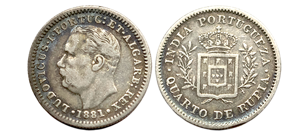 Indo-Portuguese, Luis (1861-1889 AD), Silver ¼ Rupia, 2.86Grms, Goa issue, AD 1881, OBV: Bust of luiz facing to left with date, REV: Crowned arms with value. (KM # 310). Very Fine.
