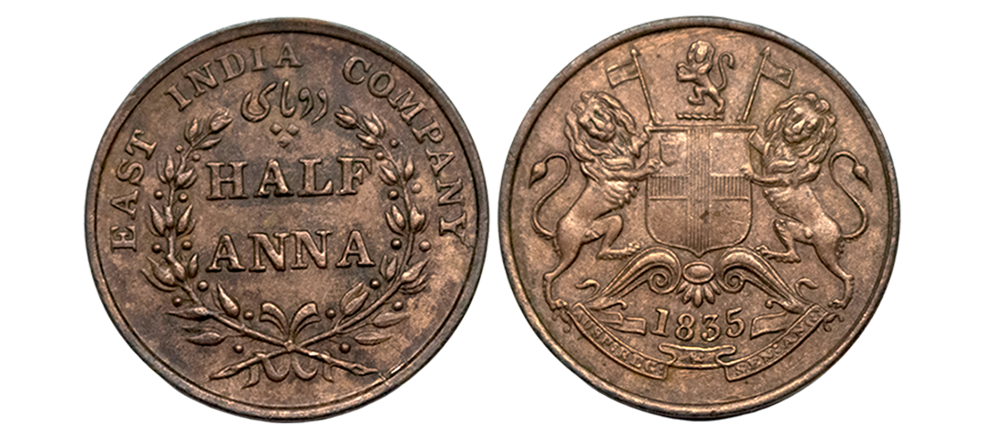 Madras Presidency, copper 4 pice, AD 1825 / AH 1240. Obverse: East India Company coat of arms. Reverse: Numerical Persian value between sprays, KM 431, Very scarce.