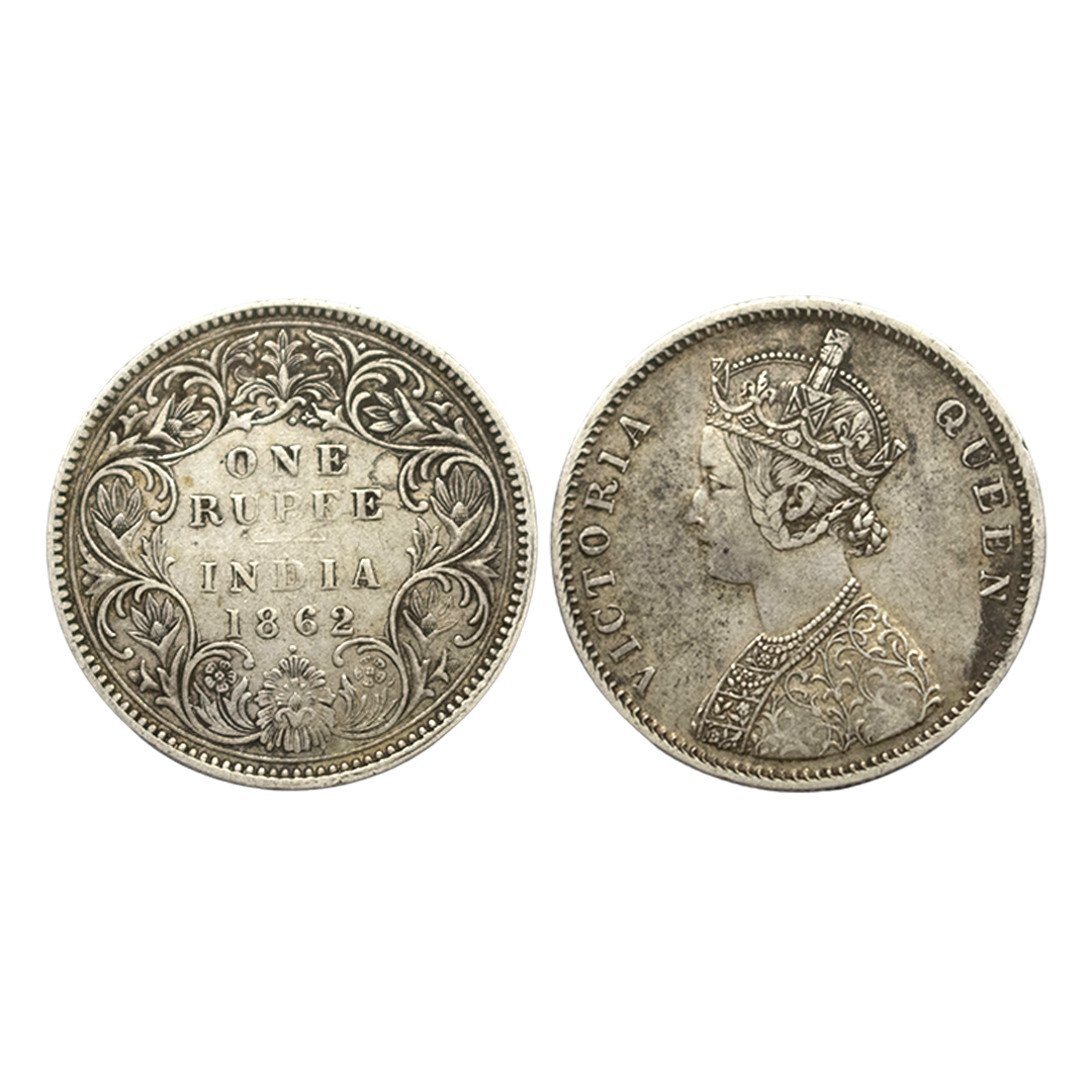 Victoria Queen, Silver Rupee, 1862, Madras Mint, B/II, Without Re-engraving of hair and with enclosed frame effect, (PR # 57/GK # 266), ghost image visible on both sides, strong features, mirror-like surface, superb quality, graded & slabbed by NGC as MS 64, Extremely Rare in this grade.Note: NGC records only 2 coins in higher grades.