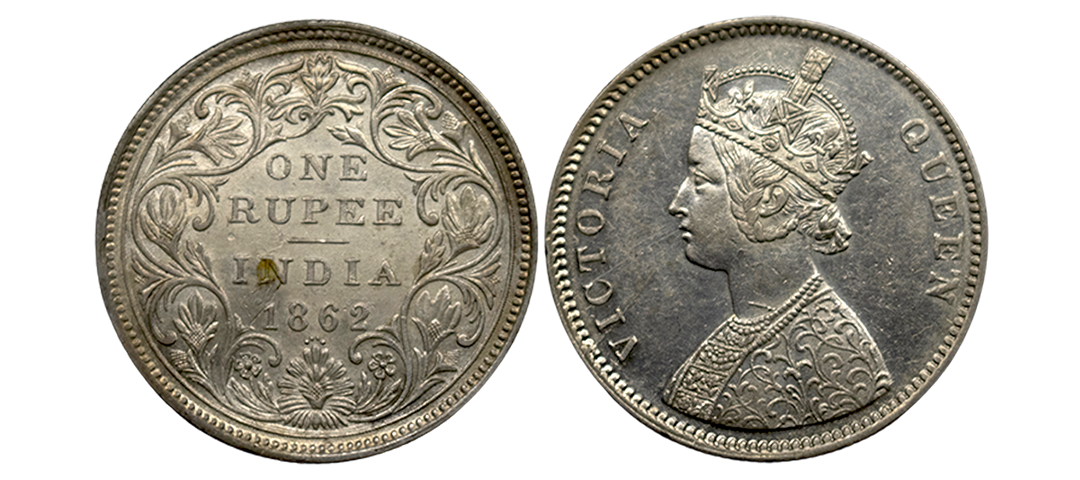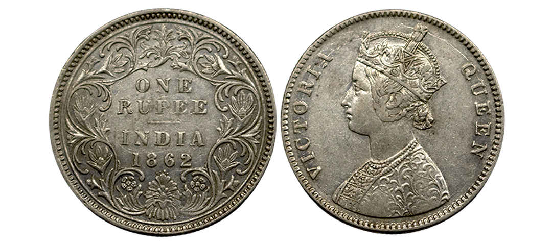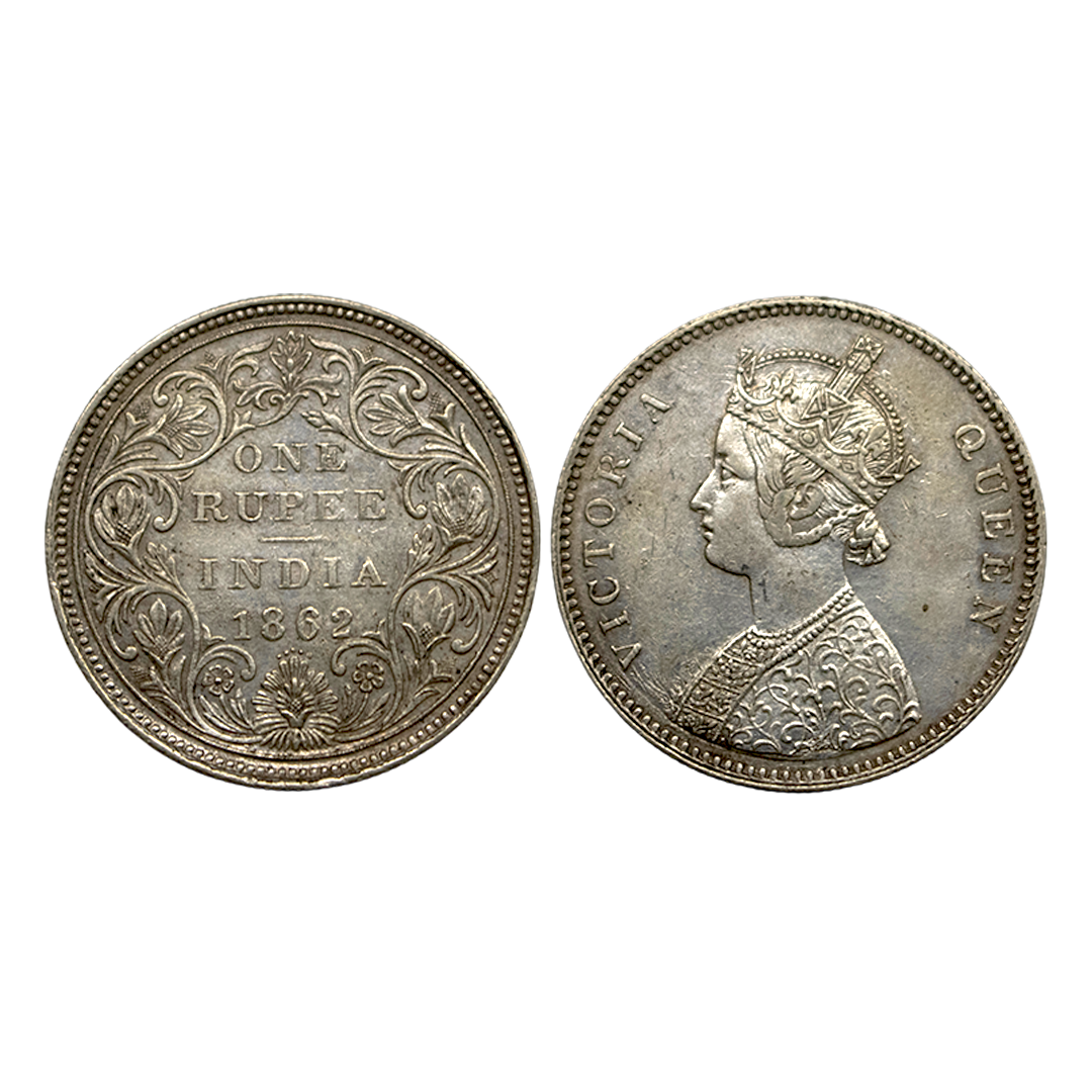 Victoria Queen, Silver Rupee, 1862, B/II, 0/4 Dots, Straight Line, About Uncirculated, Very Scarce.