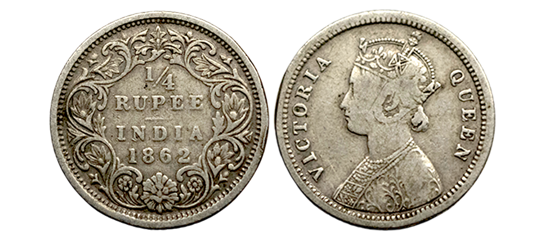 Victoria Queen, Silver 1/4 Rupee, 1840, Continuous Legends, Calcutta Mint, Graded AU58 by NGC, Rare.