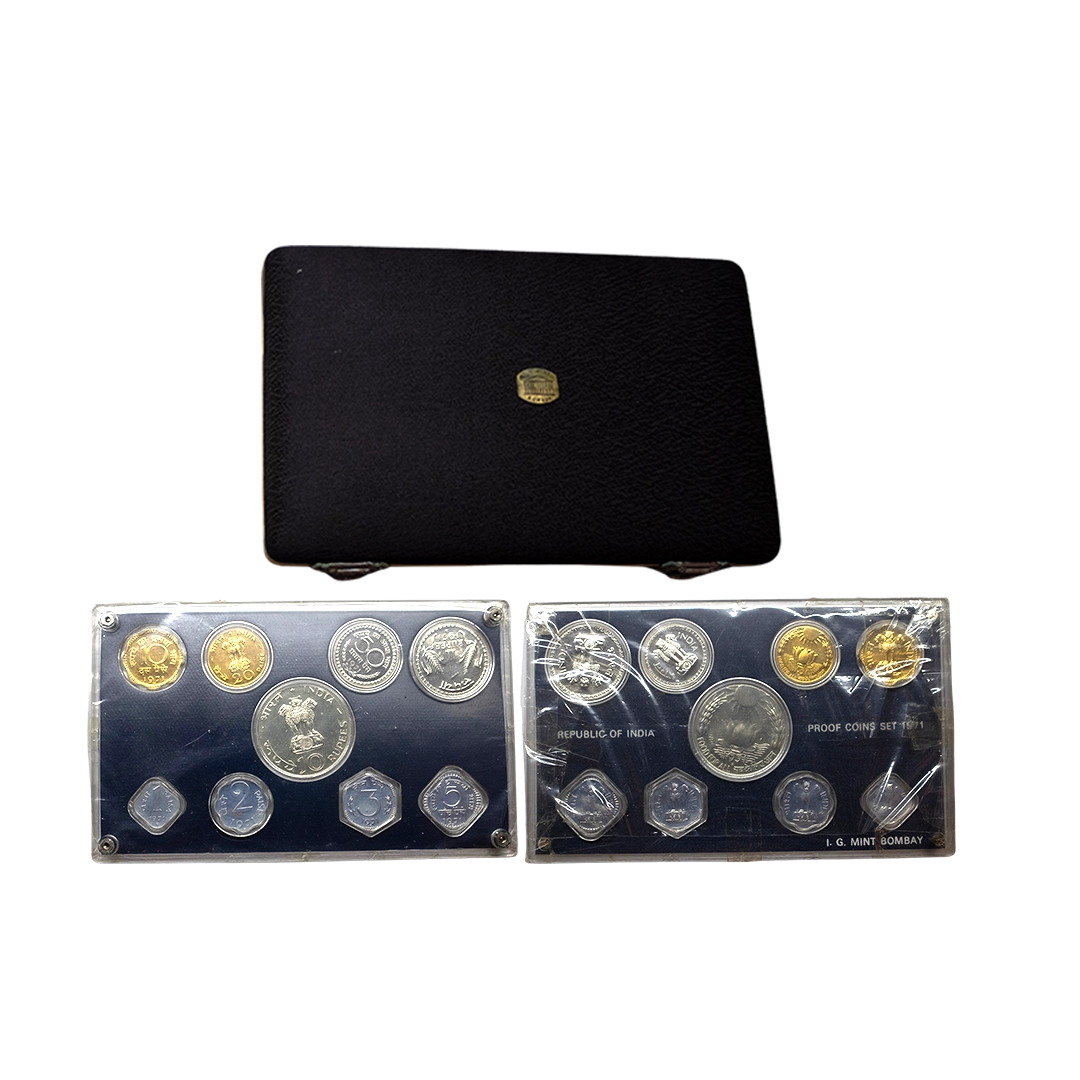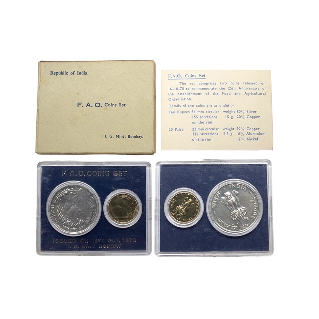1970, Food for All, Proof set of 9 coins, 10 rupees, 1 rupee, 50 paise, 20 paise, 10 paise, 5 paise, 3 paise, 2 paise and 1 paisa, Bombay mint, RB 23, in original mint packing and outer cover tattered a bit with detail card.