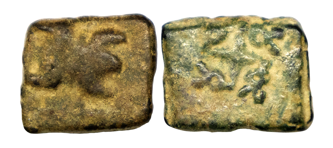 Saurashtra Janapada, (75-50 BC), set of 2, Uninscribed die-struck Copper Unit, 2.56 gms, Obv; Six armed symbol with indradhwaja, Rev: tortoise, 2.18 gms, obv. Six armed symbol with indradhwaja, Rev. bold swastika, Pieper # 505 & 494, very fine, scarce.