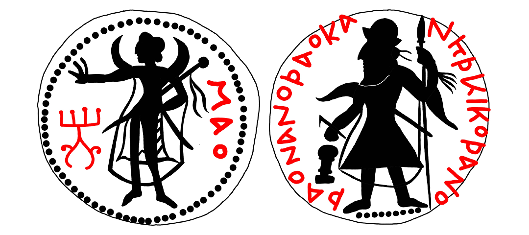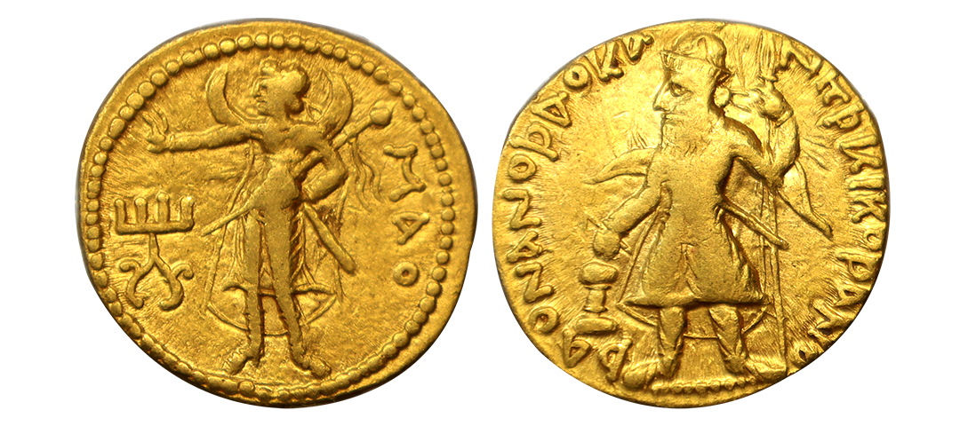 Kushans, Kanishka I (127-152 AD), 'Mao' Type, Gold Dinara, 7.85gms, Obv. Standing King holding a spear in his left hand and with right hand sacrificing at a fire altar, Bactrian legend around reading ‘þAONANOþAO KA - NηþKIKOþANO’, Rev. Mao (Mithra) standing to left, extending hand in benediction and holding scepter, tamgha at left, Bactrian legend at right ‘MAO’, Dotted border, ANS Kushan 379, very fine+, very rare.