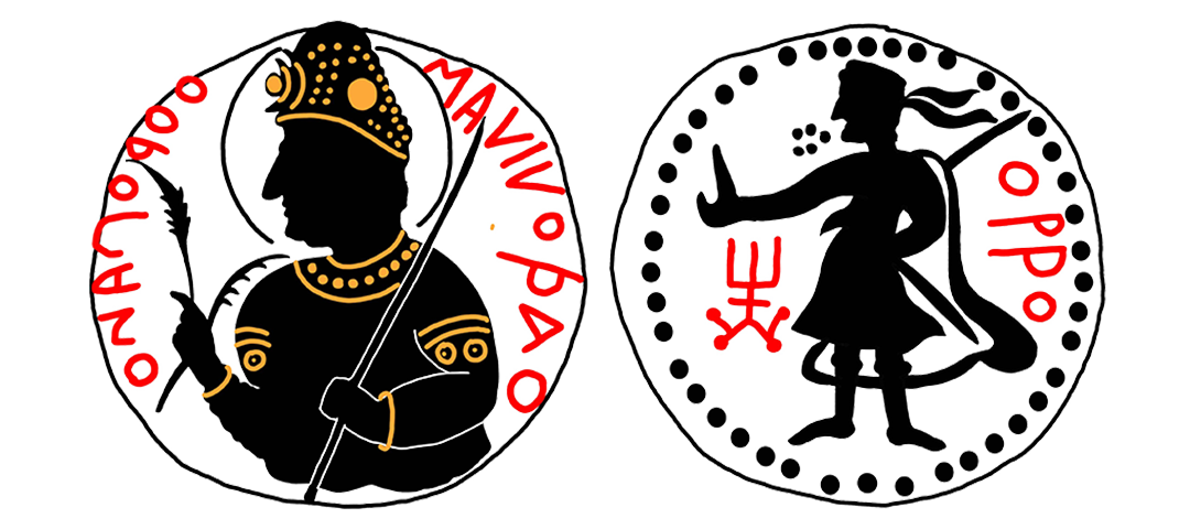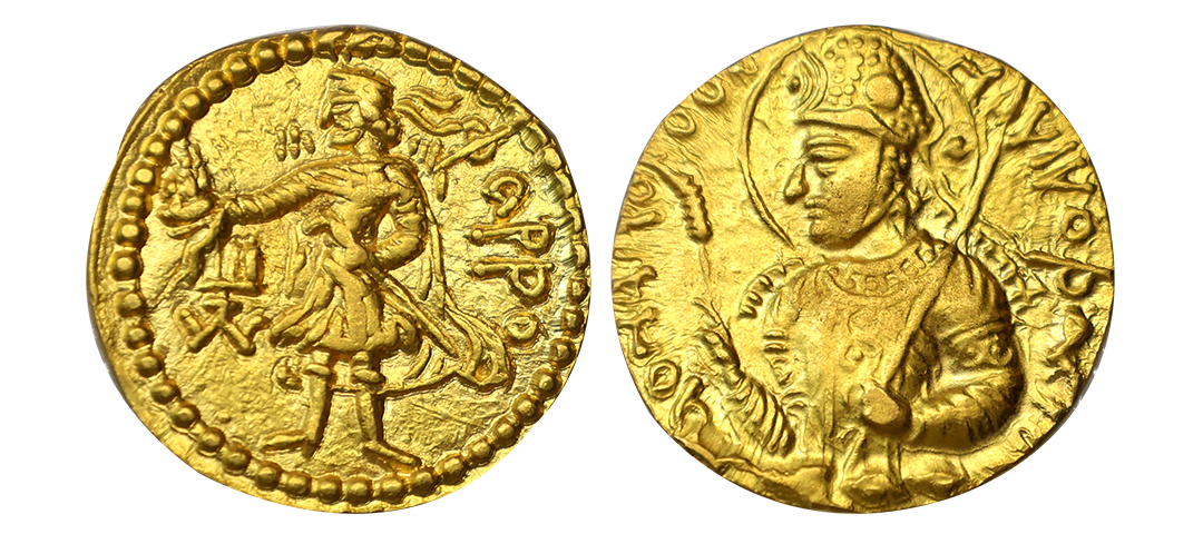 Kushans, Huvishka (151-190 AD), Pharro (Hermes-Mercury) Type, Gold Dinar, Obv. nimbate and helmeted bust of the king emerging from clouds, holding sceptre in right hand and spear over left shoulder with Greek legend'ÞAONANOÞAO O-OHÞKI KOÞANO' around, Rev. ΦAPPO, Pharro (Hermes-Mercury) standing to right, holding bowl and hilt of sword, tamgha to left field, MK #280/1, extremely fine, very rare reverse type.