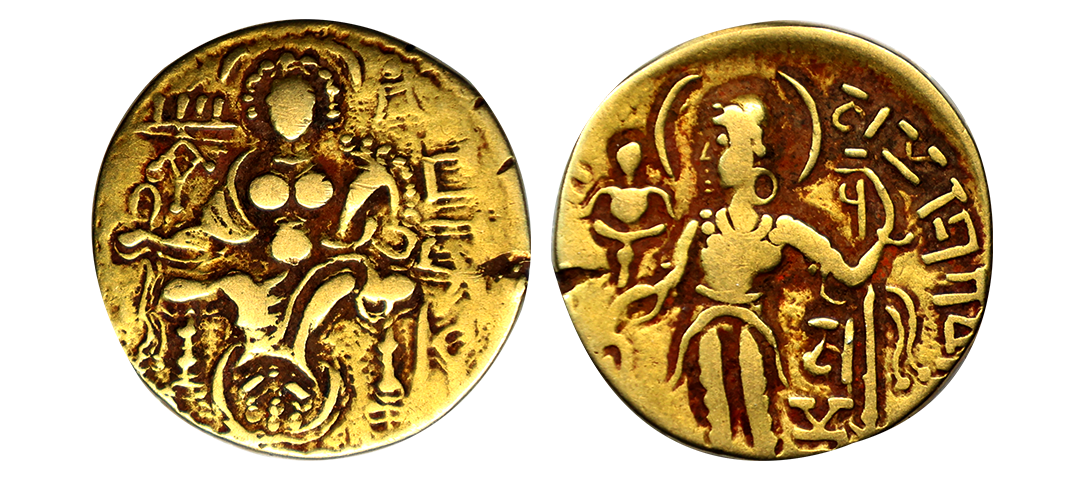Samudragupta (335-380 AD), Javelin type, Gold Dinar,7.55gms, Obv. King standing facing left, holding a Javelin in his left arm and sacrificing at an altar with his right arm, Garuda standard behind the altar, Brahmi legend around partially reading ‘SaMaRaShaTaVi(tatavijayojitaripurajitodivamjayati)’, Brahmi legend below left arm reading vertically as ‘SaMuDra’, Rev. Goddess Ardoksho seated on throne, Holding diadem and cornucopia, Tamgahat left, Brahmi legend in right field reading as ‘PaRaKraMah’, TOTGE #, Javelin Type, Class II, about very fine, rare.