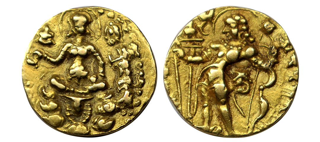 Guptas, Kumaragupta I (409-450/452 AD), Gold Dinar, 7.77 gms, Archer Type, Obv. King facing to his right with bow & arrow next to a garud banner with partial legends around ‘Jayati Mahitalamekah Sri KumarguptahSudhanvi’, Rev. goddess seated on lotus offering oblations with right hand and legends ‘SriMahendra’, TOTGE Class III B1, extremely fine, very rare.