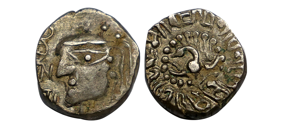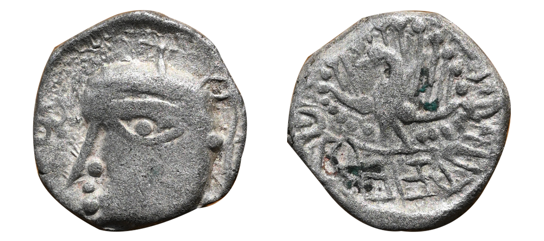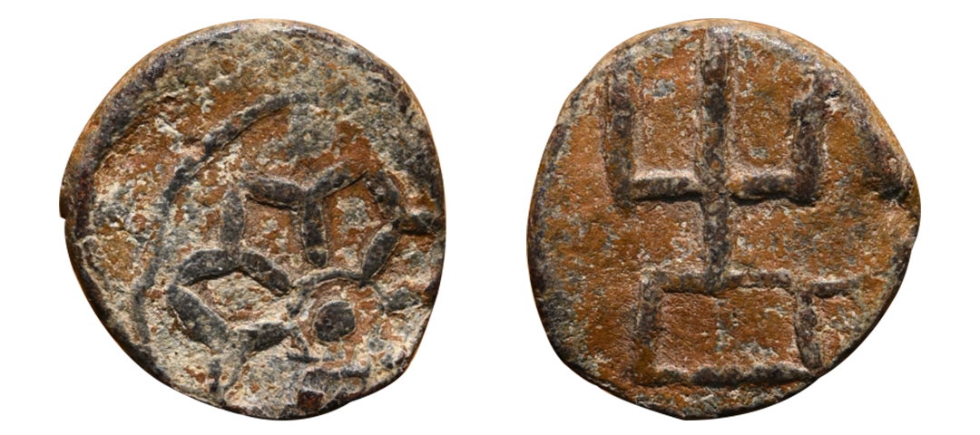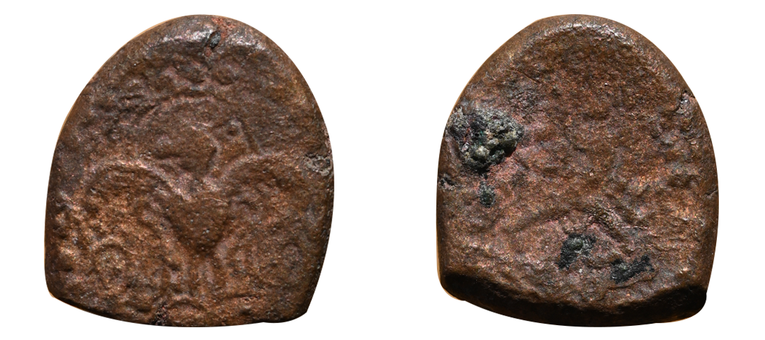 Ancient, Banvasi Region(3rd to 4th century AD), Vakataka Influence, Lead Unit, 1.01 gms, Obv. Lotus in circular border, Rev. trident above rectangular post, exact type unlisted, very fine+, very rare.