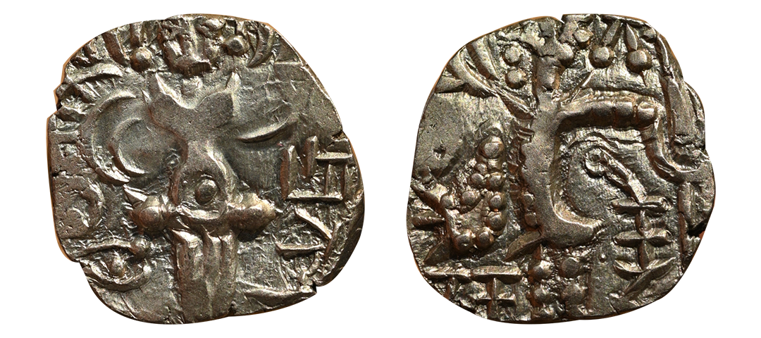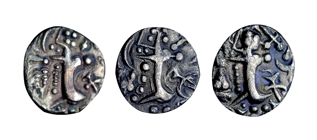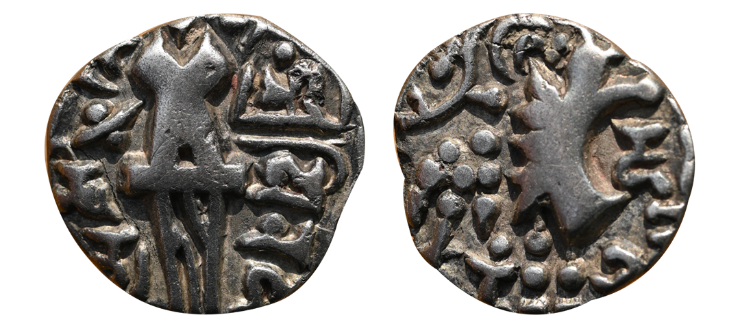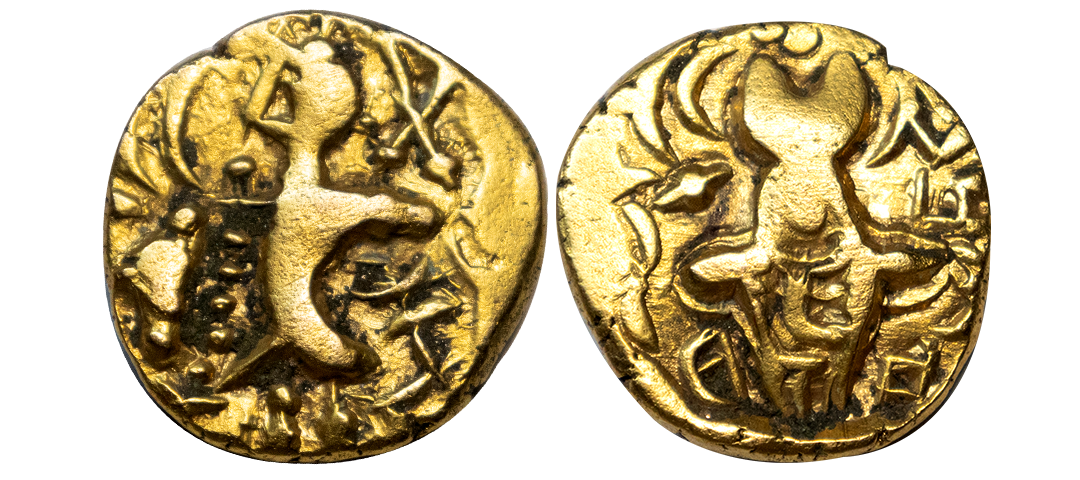 Later Kushan Rulers, Narendra, Kidaras (4th Century AD), Debased Gold Dinara, 7.49 gms, Obv. King standing to left, Legend ‘Kidara’ under his left arm and Kusha(na) further to the right, Rev. Crude depiction of ardoksho Brahmi legends 'SriNare(dra), extremely fine for the type, rare.