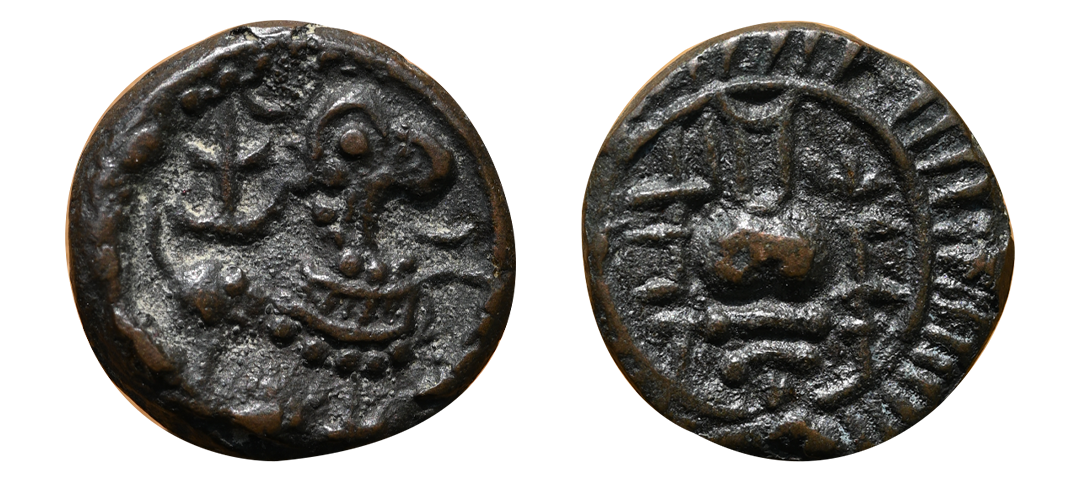 Kashmir Karkota Dynasty, Vinayaditya (c. 7th Century AD), Debased Gold Dinara, 7.20 gms, Obv. crude depiction of standing king, Rev. crude depiction of seated Lakshmi. Siddamatrika Legend “ShriViNaYa” on right field, extremely fine, very scarce.