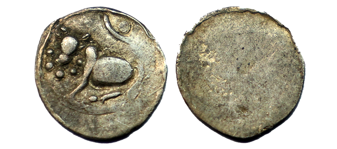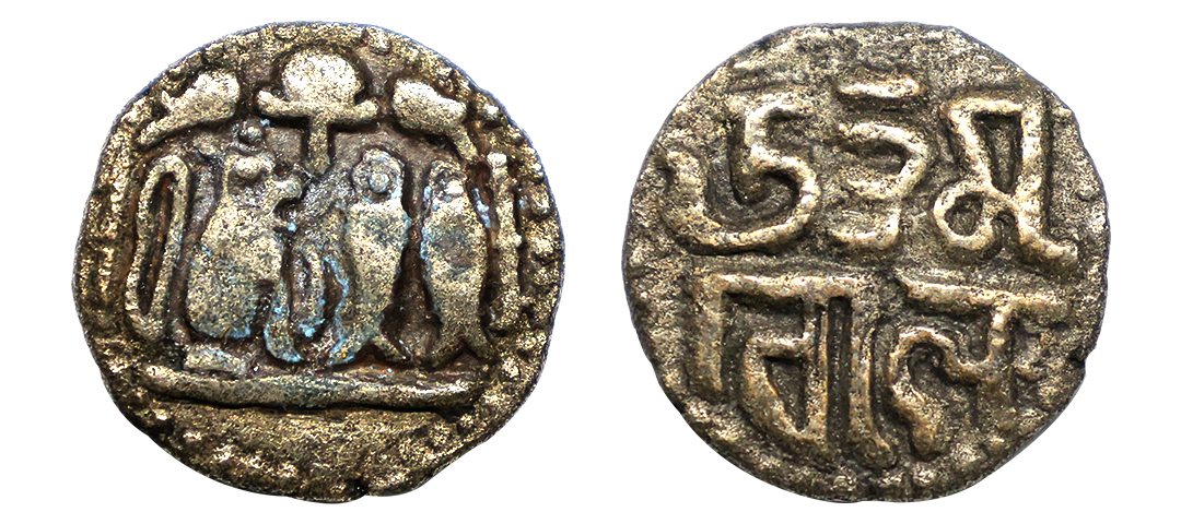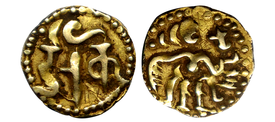 Eastern Chalukyas - alloyed copper coin of Kubja Vishnu Vardhana (624-641 AD) alias Vishamasiddhi in 'Vishnukundin' fabric, 3.29g. Obv: maned lion standing with one paw raised, with tail curled on the back, facing right; dagger to right and Brahmi legend …Vishama… above. Rev: Kalasha (vase of plenty) resting on a lotus between two lamp stands, enclosed in rayed circle. Extremely fine, Extremely rare.