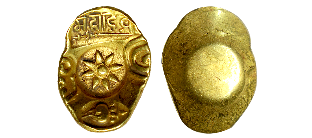 Yadavas of Devagiri, Mahadeva (1261-1270 AD), Gold Padmatanka, 3.78 gms, Obverse: Five punches: 2 x Kannada letter 'Shri', 1 x Sankha (Conch), 1 x Lotus at centre and 1 x Nagari legend ‘MaHaDeVa’ with a javelin below, extra fine, very rare in this condition.