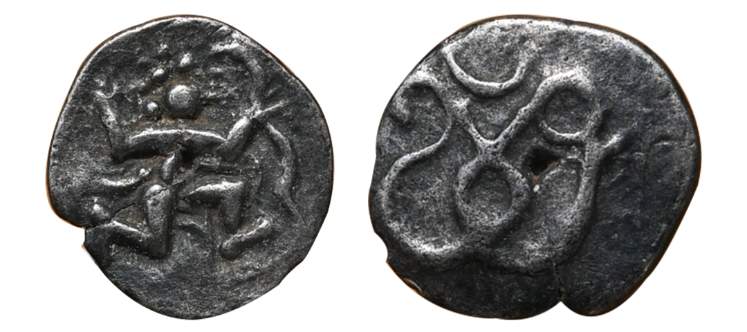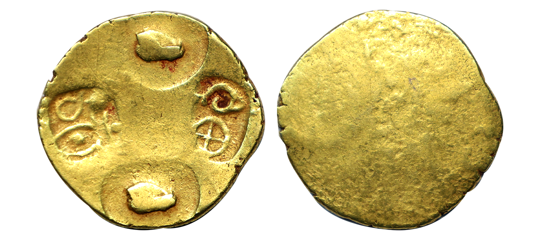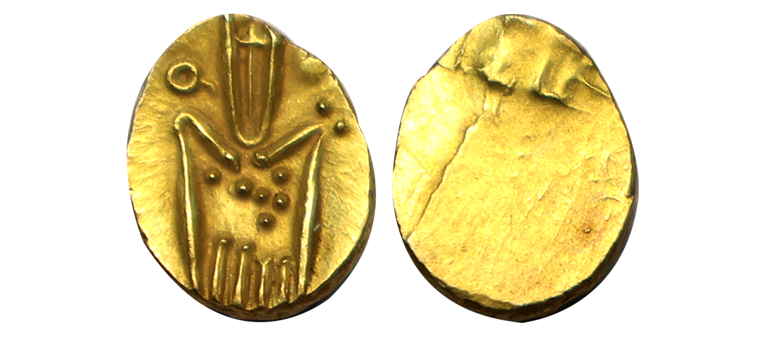 Kingdom of Mysore, gold fanam of Kanthirava Narasa Raya (1638-1662 AD), 0.25g. Obv: Narasimha seated in Yogabandha posture. Rev: Crude devanagri legend Shri Kanthi Rava in three lines.