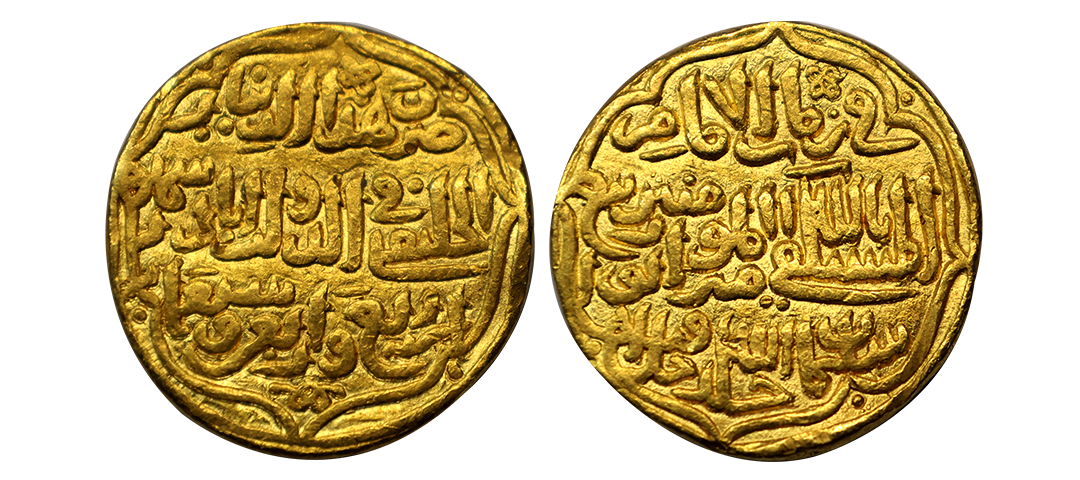 Delhi Sultanate, Tughluq Dynasty, Muhammad bin Tughluq (AH 725-752 /1325-1351 AD), Gold Dinar, 10.91 gms, AH 744, In the name of Abbasid Caliph Al Mustakfi, Obv. fi zaman al-imam al-mustakfi billah amir al-mu'minin Abu Rabia Sulaiman khuld Allahu khilafatahu, Rev. durba hadha al-Dinar al-khalifa fi al-Daulatabad Shahur & date below, G&G # D425, extremely fine, very rare.