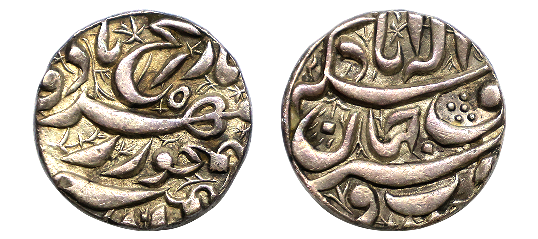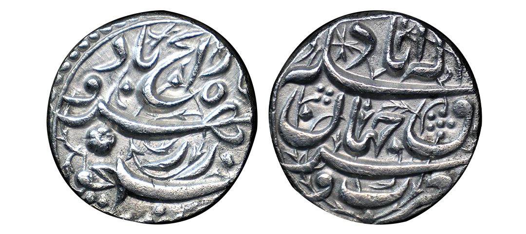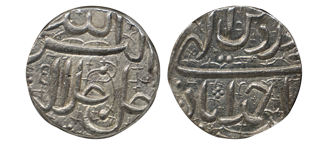 Akbar (AH 963-1014/1556-1605 AD), Ahmadabad Mint, Silver Rupee, Month Farwardin, Obv: Arabic legend "Jalla Jalalahu Allahu Akbar", Rev: Persian legend month "Farwardin" with badi "yay" at the top, "Elahi" & "zarb Ahmadabad" at the bottom, (KM# 93.2), graded by NGC as MS63, Extremely rare in such high grade.