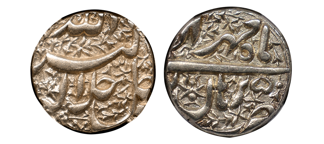 Akbar (AH 963-1014/1556-1605 AD), Burhanpur Mint, Silver Rupee, Elahi 50, Month Mihr, Obv: Arabic legend "Jallu Jalalahu Allahu Akbar", Rev: Persian legend "Elahi 50" with month "Mihr" at the top & "zarb Burhanpur" completely visible at the bottom, (KM # 93.7), well decorated on both the sides with floral pattern, choice quality, graded by NGC as AU58, Very Rare.