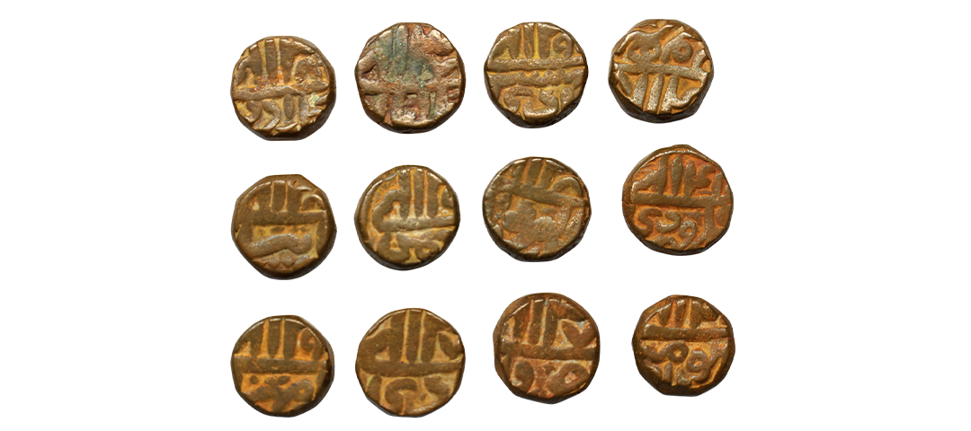 Akbar (AH 963-1014, 1556-1605 AD), Copper Dam, Delhi Mint, Full 12 Ilahi Months Set, KM #32.9, extremely fine, rare as a set.