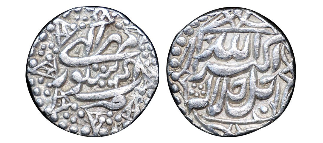 Akbar (AH 963-1014, 1556-1605 AD), Silver Rupee, 11.30 gms, Sitpur Mint, Ilahi Month Mihr (Libra), Year 48, Obv. Jalla Jalaluhu Allahu Akbar within a quarter foil, Rev. zarb Sitpur with Ilahi 48 at the bottom & month Mihr at the top, in an octagonal border, KM # 93.18, extremely fine, rare.