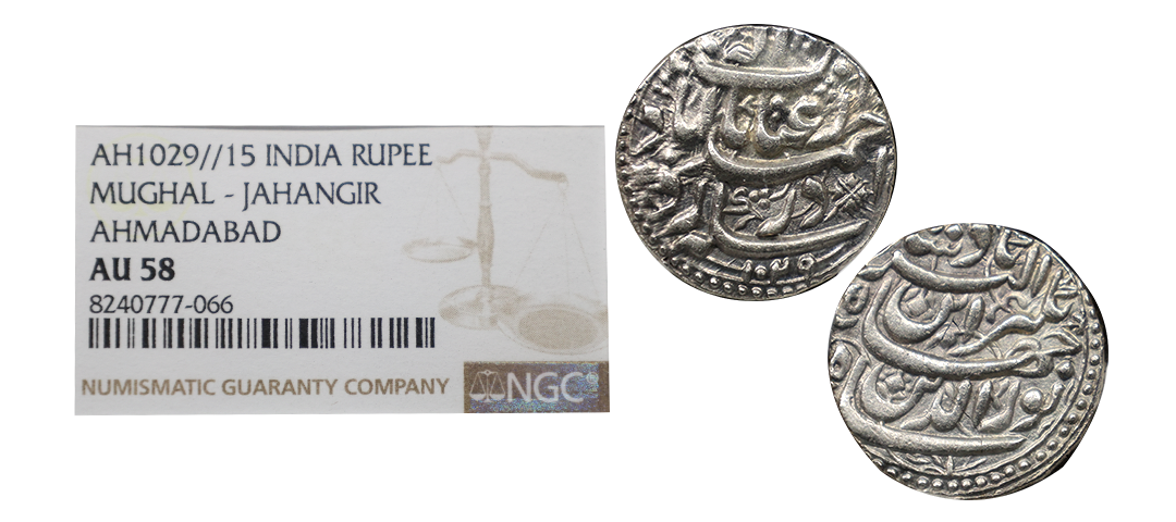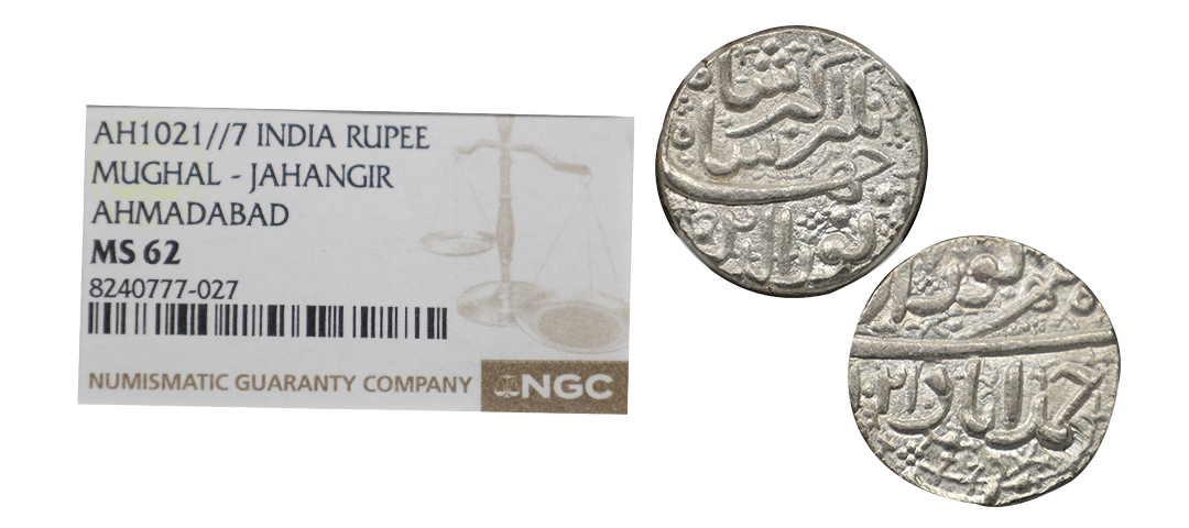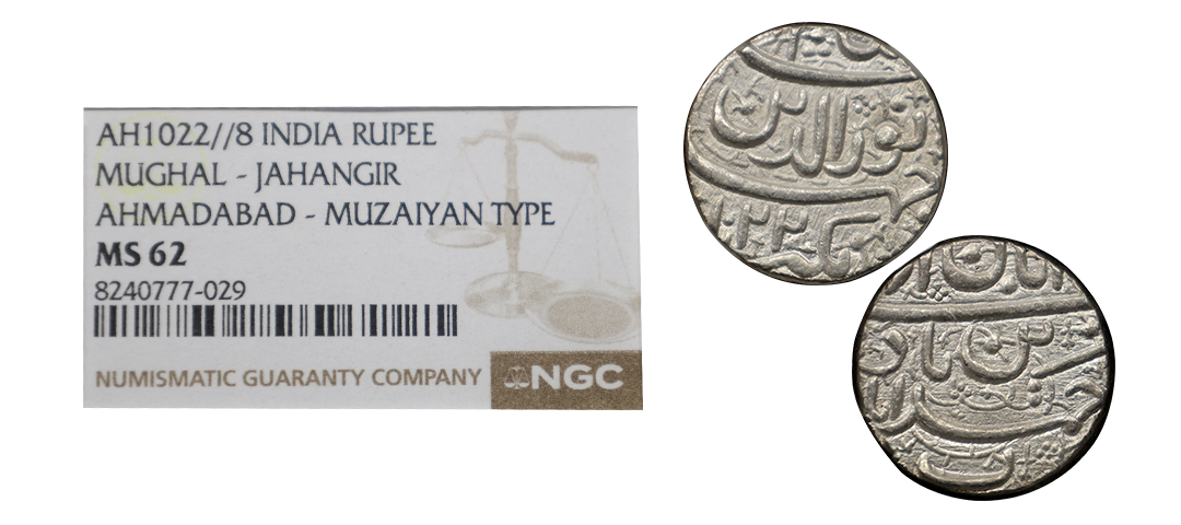 Jahangir (AH 1014-1037 /1605-1627 AD) Ahmadabad Mint, Silver ½ Rupee, 5.71 gms, Muzaiyan Couplet, Ilahi Month Isfandarmuz, AH 1022, Obv. ba naam Shah Nur ud din Jahangir, Rev. Ilahi month on top, muzaiyan zarb ahmadabad at the bottom, KM # 137.1, very fine+, very rare.