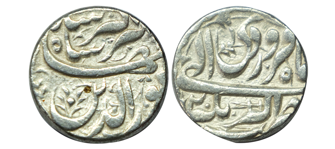 Jahangir (1605-1627 AD), silver rupee, Akbarnagar mint, Two Pointed Katar Mint Mark, Farwardin, RY 20, 'Nur ud-din' type, KM 145.4, 11.38g. Good very fine, Rare
