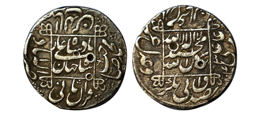 Shah Jahan (AH 1037-1068; 1628-1658 AD), Silver Rupee, Broad Flan, 11.41 gms, Akbarabad Mint, AH 1045, RY 8, Obv. Kalima Shahada Hijri year 1044 within a dotted square frame the four Caliphs' names in the margins, Rev. Shahjahan Badshah Ghazi ry 8, saheb-e-qiran sani Shihab-ud-din Muhammad zarb Akbarabad in the margins, KM #235.3, nearly completely strucked, Extremely fine+, very rare.