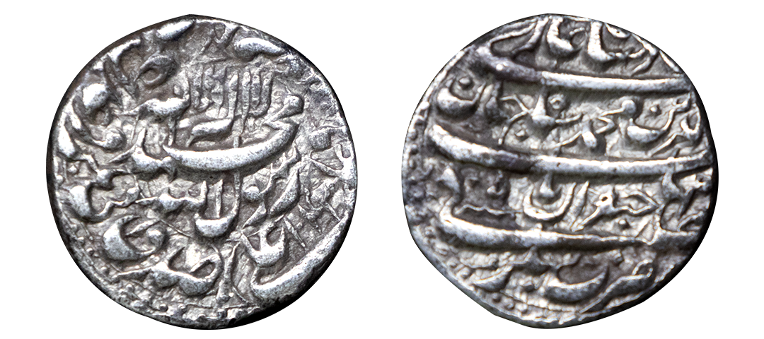 Shah Jahan (AH 1037-1068; 1628-1658 AD), Silver Rupee, Broad Flan, 11.41 gms, Akbarabad Mint, AH 1045, RY 8, Obv. Kalima Shahada Hijri year 1044 within a dotted square frame the four Caliphs' names in the margins, Rev. Shahjahan Badshah Ghazi ry 8, saheb-e-qiran sani Shihab-ud-din Muhammad zarb Akbarabad in the margins, KM #235.3, nearly completely strucked, Extremely fine+, very rare.