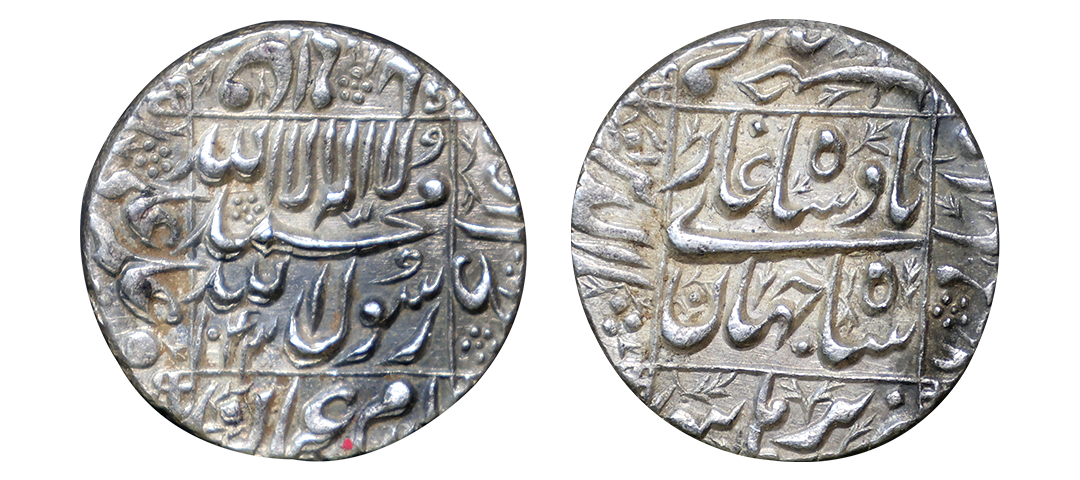 Shah Jahan (AH 1037-1068, 1628-1658 AD), Silver Rupee, 11.31 gms, Allahabad Mint, AH 1044, RY 6, Obv. Kalima Shahada within a square frame four Caliphs' names at the margins, Rev. Shah jahan Badshah ghazi in centre & Saheb-e-qiran Sani Shihab-ud din Muhammad zarb Allahabad in margins, KM # 235.5, very fine, completely strucked, very scarce.