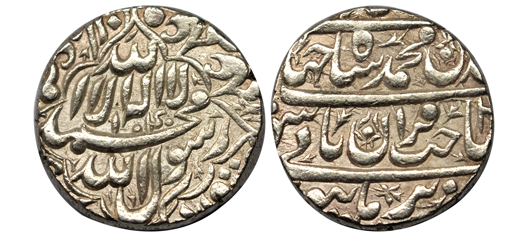 Shah Jahan (1628-1653 AD), Silver Rupee, Bhakkar Mint, AH 1042/RY 5, with Emperor's full name and title and different reverse legend layout than usual. 11.38g, About Extremely Fine, Very Rare