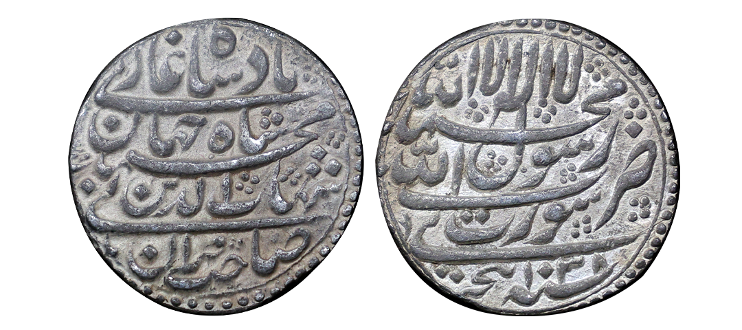 Shah Jahan (AH 1037-1068, 1628-1658 AD), Silver Rupee, 11.33 gms, Patna Mint, Obv. Kalima Shahada within a square four Caliphs' name around in margin, Rev. Shahjahan Badshah Ghazi, saheb-e-qiran sani Shihab-ud-din Muhammad zarb patna in margins, KM # 235.20, struck on big flan, about fine, scarce.