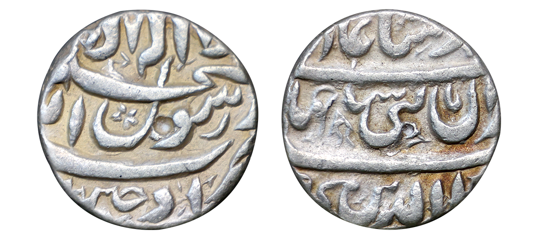Shah Jahan (1628-1658 AD), silver ½ rupee, Surat mint (Complete), (103)7/ Ahad, First Ruling Year, both sides legend in four lines, KM 213.2, 5.68g. Obv: Emperor's full name and title sahib-e-qiran sani shihab ud-din muhammad shahjahan badshah ghazi. Rev: The Kalima Shahada with mint-name. very fine, Rare.