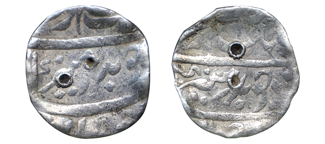 Aurangzeb (1658-1707 AD), silver rupee, MULE COIN, Badr Munir Couplet, Obv & Rev both persian legend "sikka zad dar jahan chu badre munir shah aurangzeb alamgir" 11.02g, fine, extremely rare.