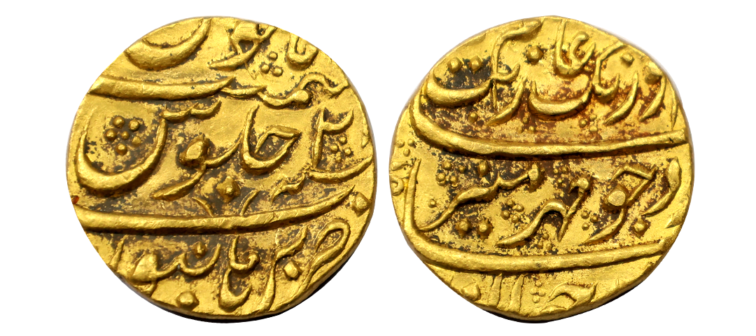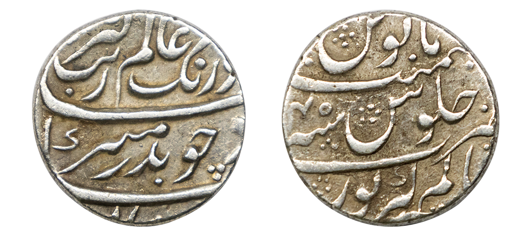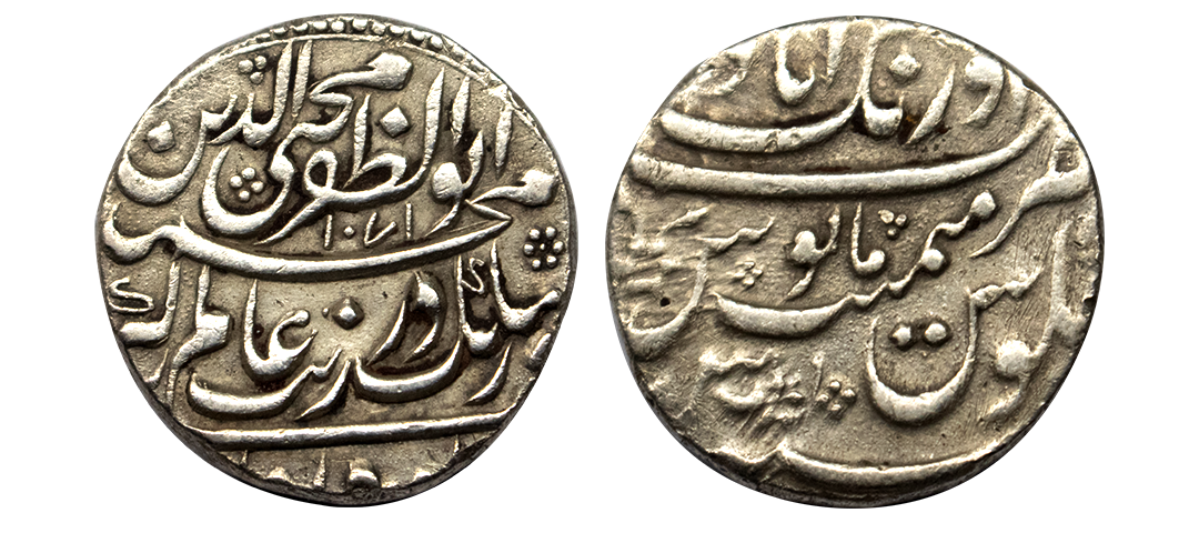 Aurangzeb (1661-1663 AD in Cooch Behar), Silver ½ Tanka, 4.77g, Alamgirnagar Mint, RY 4, struck on the Cooch Behar standard with Bengali text, obv. legend in four lines Aora /ngajeva Va/dasaha Ala/mgira a cross under va, rev. in four lines Jarava/ Alamgi/ rnagara/ Sana (4) (Rhodes Bose 55, KM 85). Very Fine, Very Rare. In 1661 Cooch Behar was invaded by the Mughuls, who occupied the area for over two years. The Mughal General Mir Jumla used Cooch Behar as a base for his ultimately disastrous expedition into Assam. During the Mughal occupation, Prana Narayan fled to Bhutan, returning only in 1663 to re-occupy the area. The name of the town of Cooch Behar was changed to Alamgirnagar (after Aurangzeb Alamgir), and coins were struck in the name of the Mughal Emperor. In style they were exactly similar to the half rupees of Prana Narayan with legend in Urdu, but written in Bengali script. This issue, which fits into both the Cooch Behar and Mughal series, is Extremely Rare. This is probably one of the only examples in Mughal numismatic history that coins were issued in a regional script. ( Ex Todywalla Auction no. 146, Lot no. 59 )
