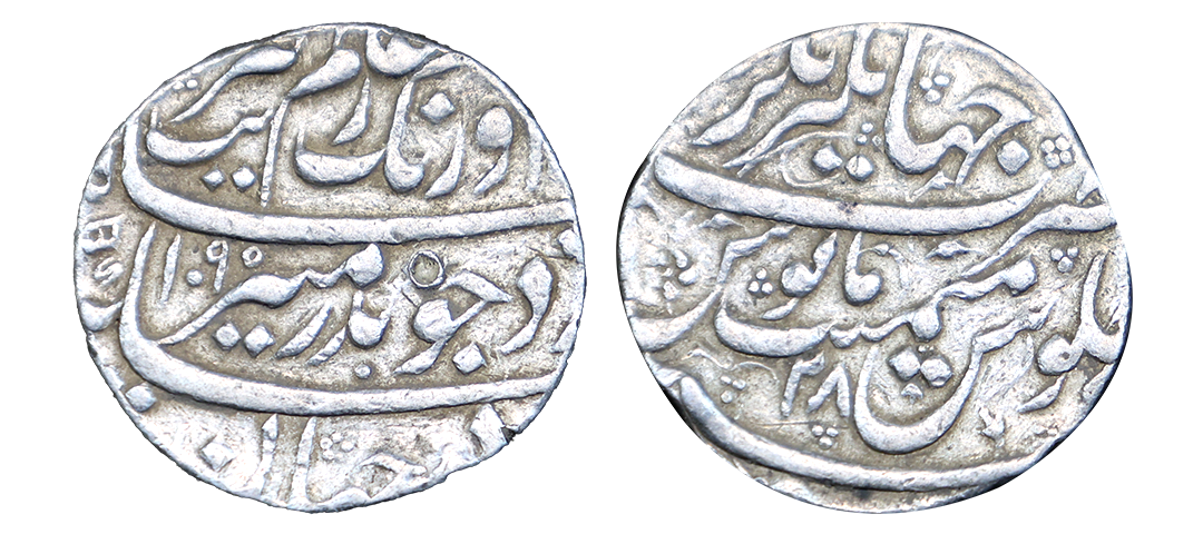 Aurangzeb (AH 1068-1118, 1658-1707 AD), Silver Rupee, 11.42 gms, Itawa Mint, AH 1109, RY 42, Obv. Sikka dar jahan zad chu badr-e-munir Aurangzeb Badshah ghazi, Rev. maimanat manus sana julus zarb itawa, KM #300.86, very fine, very scarce.