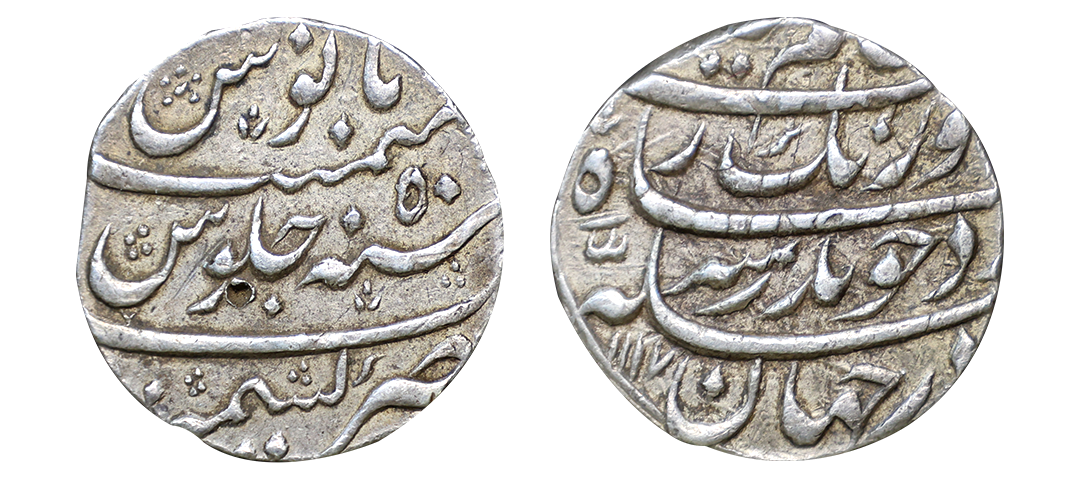 Aurangzeb (AH 1068-1118, 1658-1707 AD), Silver Rupee, 11.42 gms, Itawa Mint, AH 1109, RY 42, Obv. Sikka dar jahan zad chu badr-e-munir Aurangzeb Badshah ghazi, Rev. maimanat manus sana julus zarb itawa, KM #300.86, very fine, very scarce.