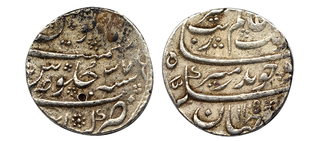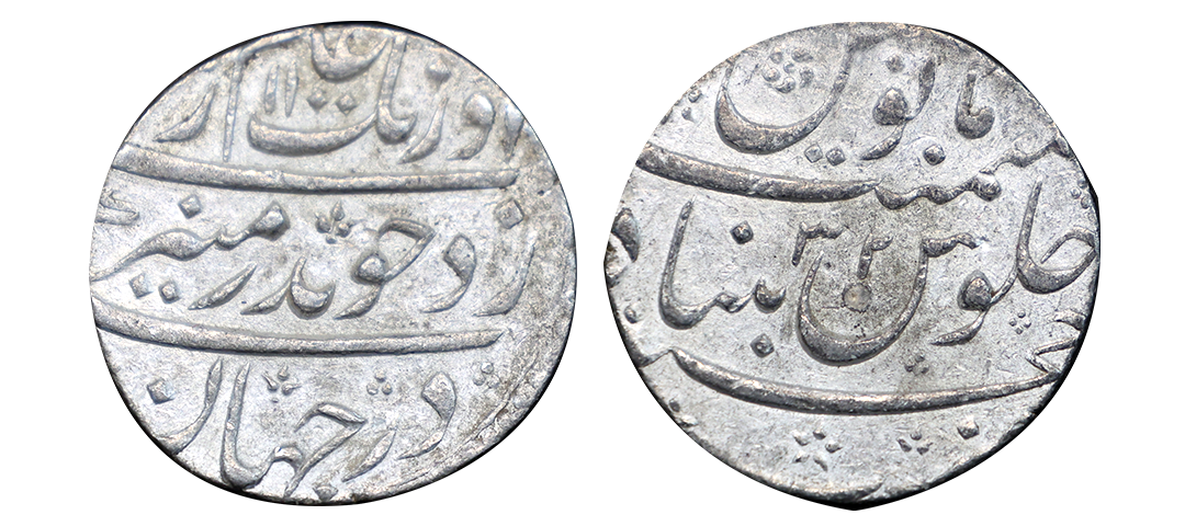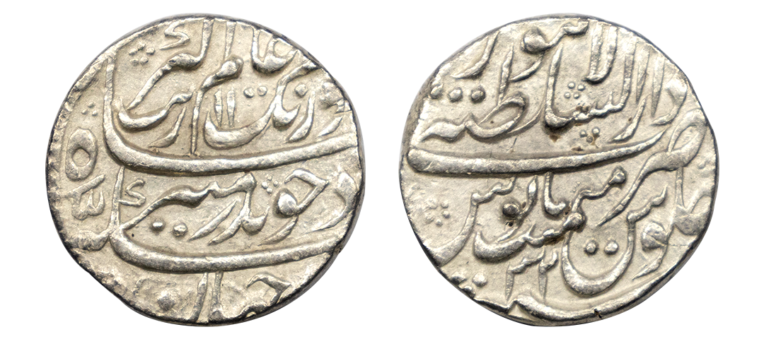 Aurangzeb (1658-1707 AD), silver rupee, Kashmir mint, AH 1117/RY 50, KM 300.96, legend in four line on obverse, 11.40g Extremely fine, Rare.