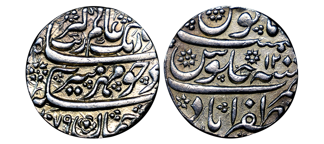 Aurangzeb (AH 1068-1118, 1658-1707 AD), Silver Rupee, 11.29 gms, Tatta Mint, ‘Mehr-e-munir’ couplet, unlisted, similar to KM # 300.87, about fine, very scarce.