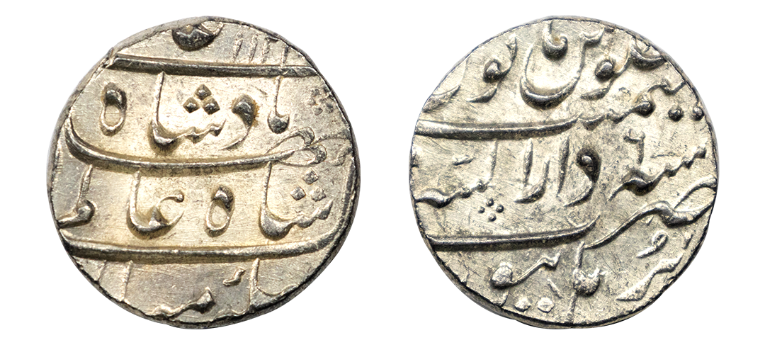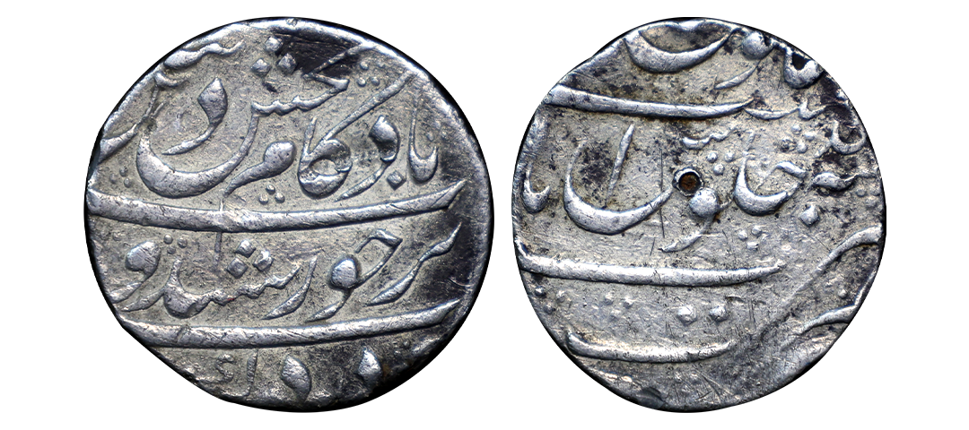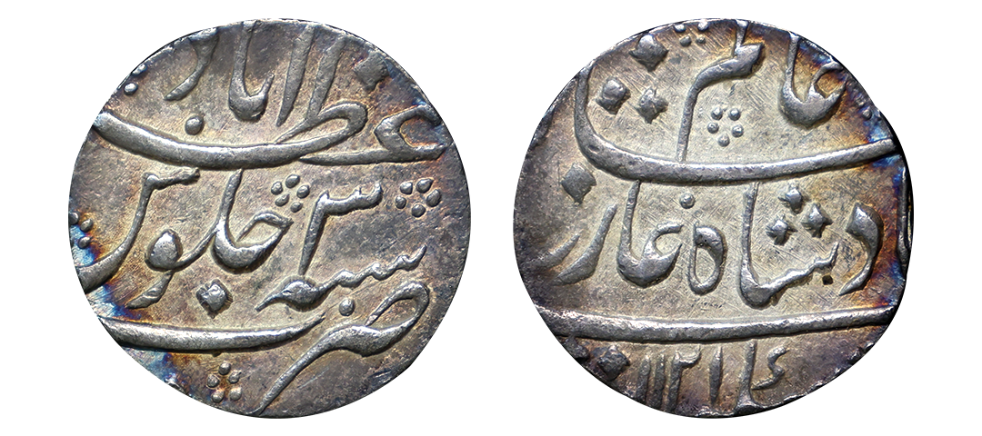 Kam Bakhsh (AH 1119-1120/1707-1708 AD), Nusratabad Mint, Silver Rupee, "Din-e-panah" Couplet, Obv: Persian legend "Sikka zad dar dakkan bar khursheed-o-mah, Badshah Kam Bakhsh, dinpanah", Rev: Persian legend "Sana julus" & "zarb Nusratabad" at the bottom, 10.8g, (KM# 336.6), countermarks, multiple test marks, about very fine, Very Rare.