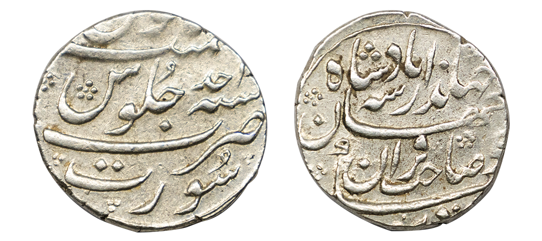 Jahandar Shah (1712-1713 AD), Silver Rupee, Surat Mint, 'Sahib Qiran' type, RY Ahd, KM 364.19. Very Fine, Scarce.