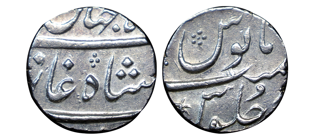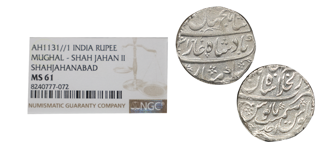 Rafi ud-Darjat (1719 AD), silver rupee, Dar ul-Khilafat Shahjahanabad mint, 'Ba-Hazaraan Barkaat' couplet, AH 1131/RY Ahd, KM 405.19, 11.08g. Obv: Persian legend sikka-e-zad bahind bahazaran barkaat shahenshahe bahr-o-bar Rafi ud Darjat with AH date. Rev: Mint-name, RY and Jalus Maimanat Manus. Extremely fine, Rare.