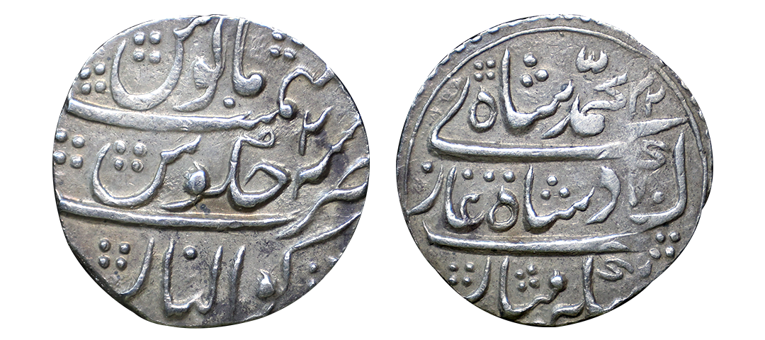 Muhammad Shah (1719-1748 AD), silver rupee, Gwalior mint, 1132 AH/ RY 2, KM 436.25. 11.3g, Broad flan, Very fine, Scarce.