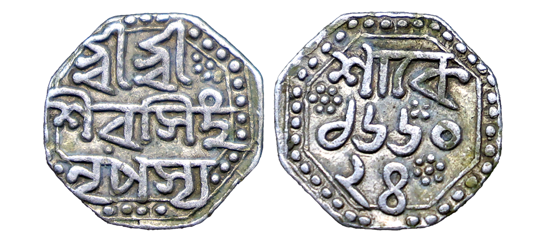Assam, Siva Simha (SE 1636-1666, 1714-1744 AD), Silver ¼ Rupee, 2.86 gms, Obv. Sri Sri/ Siva Simha/ Nrpasya, Rev. Sake/ 1660/ 24, RB # L11.1, very fine+, Extremely rare
