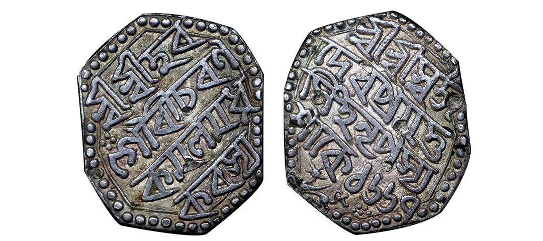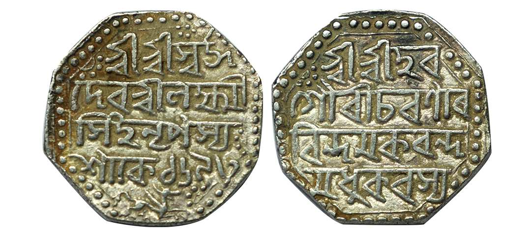 Assam, Octagonal (different shape) Silver Rupee (trial strike), 11.21g, Pramatta Simha (Siu-ning-pha) (1744-1751), Sk. 1667, Assamese legends, Obv: Sri Sri Hara/ Gauri Charana/ Kamala Madhu/karasya, Rev: Sri Sri Svarga/Deva Pramatta/ Simha Nrpasya/ Sake 1667, lion with tail down at bottom running left, Reverse die perfectly struck at 6 o'clock. Ex I.K.Kathotia collection, plate coin. (A.Mitra. refer pg 45, RB. N8.1 type unlisted). Almost Mint State, Unique. ( EX Bombay Auction No. 20, Lot No.121 ).