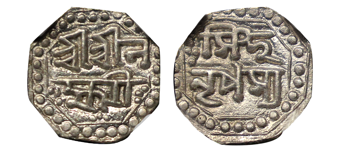 Assam, Lakshmi Simha (SE 1691-1702 / 1769-1780 AD), Silver 1/8 Rupee, Assamese legend on both sides, OBV: Sri Sri La/ksmi, REV: Simha/ Nrpasya. (A.Mitra # 316A). Graded MS63 by NGC, Extremely Rare in Such High Grades.