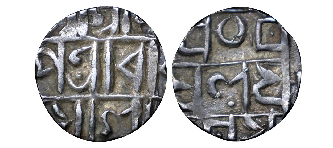 Cooch Behar, Lakshmi Narayan (SE 1509-1549, 1587-1627 AD), Silver ½ Rupee, 4.54 gms, SE 150x, Obv: sri sri / sivacharana/ kamala madhu / karasya, Rev: srisri / ma-/ n lakshminaraya-/ nasya sake /1509, dated specimens are rarer than the non dated ones & slightly hard to get, KM # 42, very fine, very scarce.