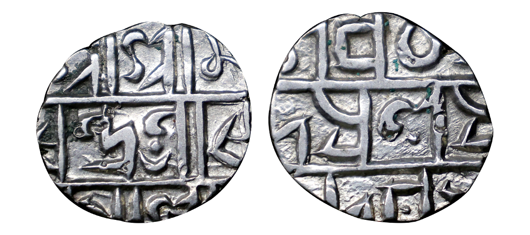 Cooch Behar, Lakshmi Narayan (SE 1509-1549, 1587-1627 AD), Silver ½ Rupee, 4.54 gms, SE 150x, Obv: sri sri / sivacharana/ kamala madhu / karasya, Rev: srisri / ma-/ n lakshminaraya-/ nasya sake /1509, dated specimens are rarer than the non dated ones & slightly hard to get, KM # 42, very fine, very scarce.