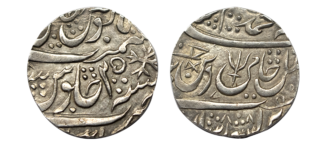 Maratha Confederacy, Bhonsla Rajas of Nagpur, Silver Rupee, 10.76 gms, Gadnarat Mint, RY 56, in the name of Ahmad Shah Bahadur, Obv. Sikka mubarak ahmad shah bahadur Badshah ghazi, Rev. manus maimanat sana 56 julus zarb gadnarat, Gadnarat Mint is mentioned in Coinage of Bhonsla Rajas of Nagpur by P.Kulkarni page no. 40, very fine+, extremely rare.