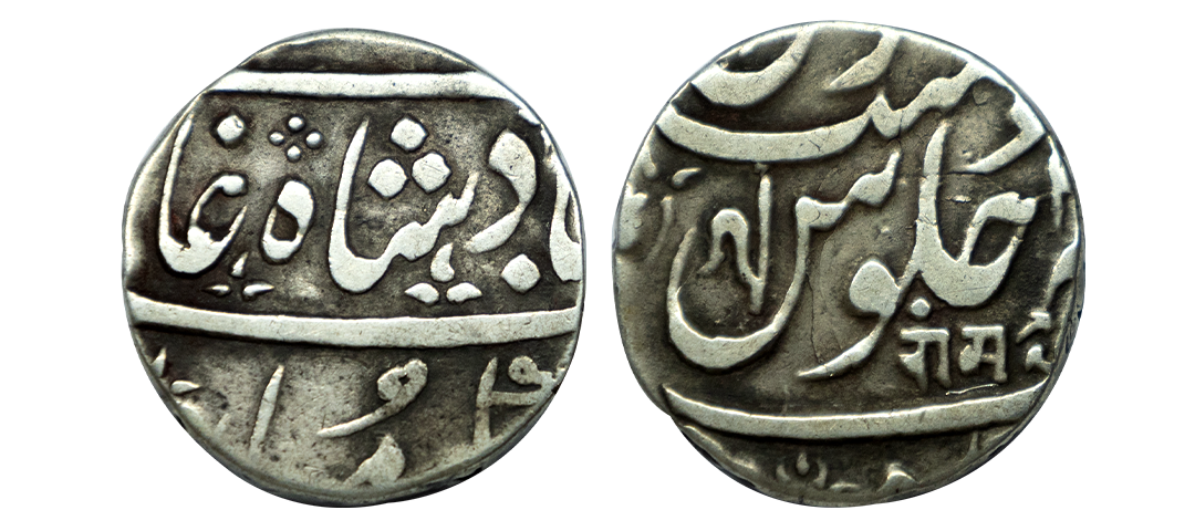 Maratha Confederacy, INO Shah Alam II (AH 1174-1221, 1759-1806 AD), Silver Rupee, 11.07 gms, Srinagar Mint, AH 1206, RY 33, Obv: saya-e-fazle elah couplet, sikka zad bar haft kishwar saya-e-fazle ilah,hami dine muhammad shah alam badshah, trishul & leaf mint mark, Rev: manus memanat sana 33 julus zarb Srinagar, KM #295, very fine+, scarce.